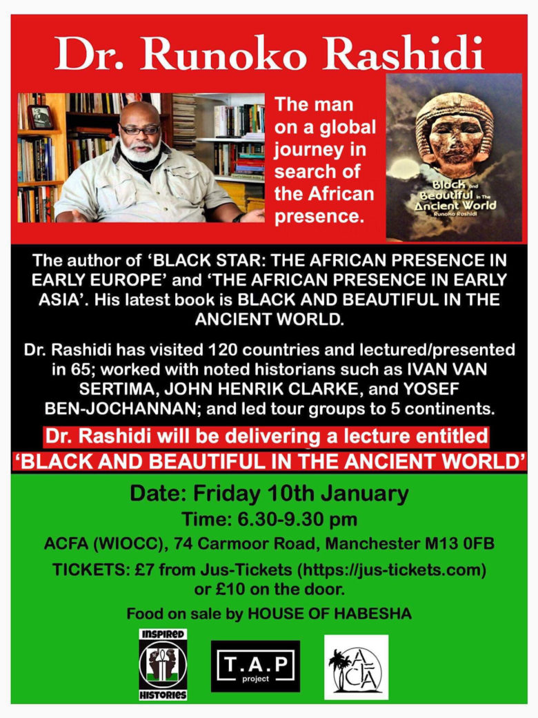 DR. RUNOKO RASHIDI, Scholar, Historian, Author and Lecturer, the man on a global journey in search of THE AFRICAN PRESENCE will be giving a lecture and promoting his latest book, BLACK AND BEAUTIFUL IN THE ANCIENT WORLD, in MANCHESTER on 10th January 2020!