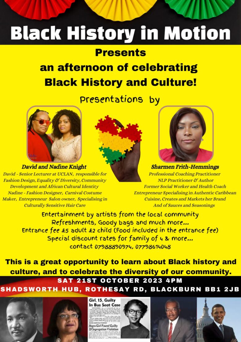 Black History In Motion presents an afternoon of celebrating Black History and Culture 4pm, Shadsworth Hub, Rothesay Rd, Blackburn, BB1 2JB. Entrance fee Adults £5, Children £2, Food included