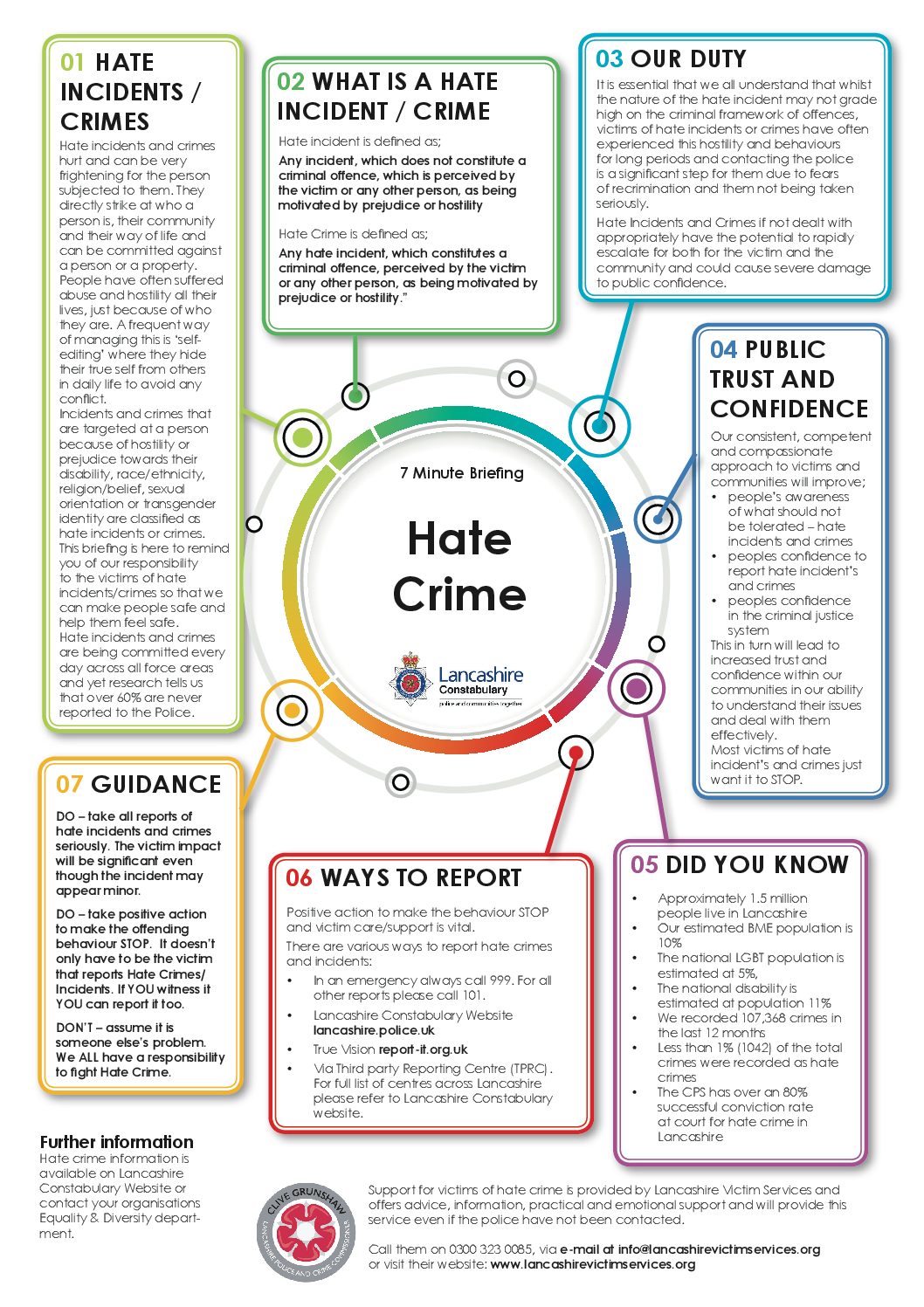 Our partner PC 3448 Ashley Gibson at Lancs Constabulary Diversity Unit has sent us this poster about Hate Crime and how to report it. Please share it widely. Thanks