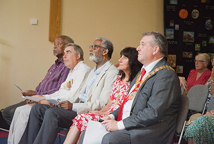 Clinton Smith (Chair, Preston Black History Group), Prof Alan Rice, UCLAN, IBAR (Institute for Black Atlantic Research, MIDEX (Research Centre for Migration, Diaspora and Exile), Prof Gregory S Cooke (US Film maker and educator), Kim Lomax (Mayoress of South Ribble Borough Council), Chris Lomax (Mayor of South Ribble Borough Council).